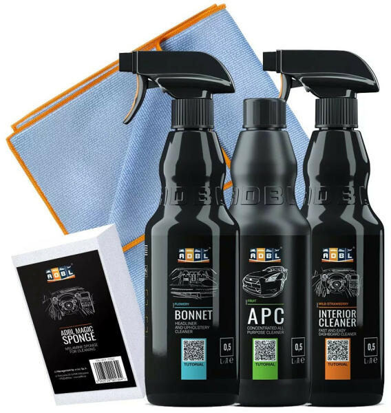 1. ADBL APC 500ml - általános célú tisztítószer, amellyel a műanyag és gumi felületeket, ajtónyílásokat, ajtótömítő gumiprofilokat, küszöbök belső műanyag takaróelemeit, ajtózárak környékét, műszerfalat, két első ülés közötti konzolt, ajtóborítás / kárpit műanyag részeit (különösen az ajtóbehúzó fogantyúkat... ) varázsolhatod ragyogó tisztává. 2. ADBL Bonnet 500ml - professzionális kárpittisztító a "finomabb" szövet- / kárpitborítások (tetőkárpit, A- B- és C-oszlopok belső borítása, illetve az ajtókban lévő szövetbetétek) tisztításához. 3. ADBL Interior Cleaner 500ml - a műszerfal tisztítása végezhető el ezzel a készítménnyel, amely eltávolítja a foltokat, felfrissíti a színeket. Szépen visszaállítja az elemek színét eredetihez igen közeli állapotra. 4. ADBL Magic Sponge - melamin alapú szivacs, főként az erősen szennyezett textúrázott felületek tisztítására ajánljuk (például. küszöbök műanyag borításai) 5. Az ADBL Dodger egy széles felhasználási lehetőségekkel rendelkező mikroszálas kendő belső tér tisztításhoz. Mérete és a kialakítása miatt minden eldugott sarok elérhető vele. A szálszövés speciális technológiája lehetővé teszi a mosással való tökéletes tisztítását. Használata erősen megkönnyíti a munkát az ADBL APC, ADBL BONNET, ADBL INTERIOR CLEANER termékekkel való belső tisztítási feladatoknál, ezen termékekre optimalizált.