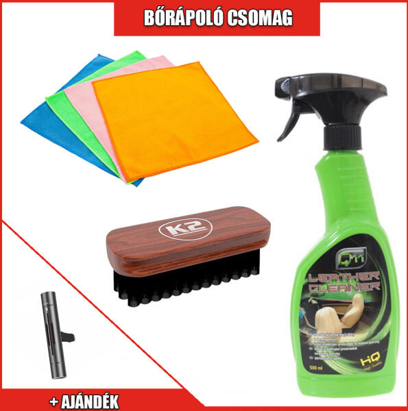 Bőrápoló csomagHa szereted az autódat akkor erre a bőrápolási csomagra biztosan szükséged lesz!Bőrülésekhez és bőrkárpitokhoz összeállított csomag amivel egy alapos bőr tisztítást és ápolást elvégezhetsz. Ha nem te szeretnéd összeválogatni a termékeket, akkor az előre összeállított csomag tökéletes választás.  Úgy állítottuk össze a csomagot, ahogyan mi is használnánk őket egy egy tisztítási munkához. Ár érték arányban a legjobb termékeket tartalmazzák.  A csomag tartalmaz egy bőr tisztító és ápoló szert, egy bőrtisztító kefét, egy  mikroszálas törlőkendőt és egy ajándék illatosítót.  A termékekről külön külön olvashatsz részletesebben. Bőr tisztító sprayA bőrüléseket és bőrkárpitokat rendszeresen tisztítani és ápolni szükséges, hogy ne repedezzenek meg és ne keményedjen ki a felületük. A bőrápoló szerek közül kiemelkedő ár érték arányú a Q11 bőrápolója. Természetes viaszt és felület aktív anyagokat tartalmaz, ennek köszönhetően a bőr még puhább és élénkebb színűvé válik. Por és nedvesség taszító réteget képez, így nehezebben koszolódnak vissza a bőrfelületek. Nem csak bőrülések és kárpitok de bármilyen más bőr anyagú termék tisztítására is kiválóan alkalmas. Akár táskákról kabátokról van szó, használható a bőrápoló spray. A készítmény kellemes ""új bőr"" illatot ad a tisztított felületnek.