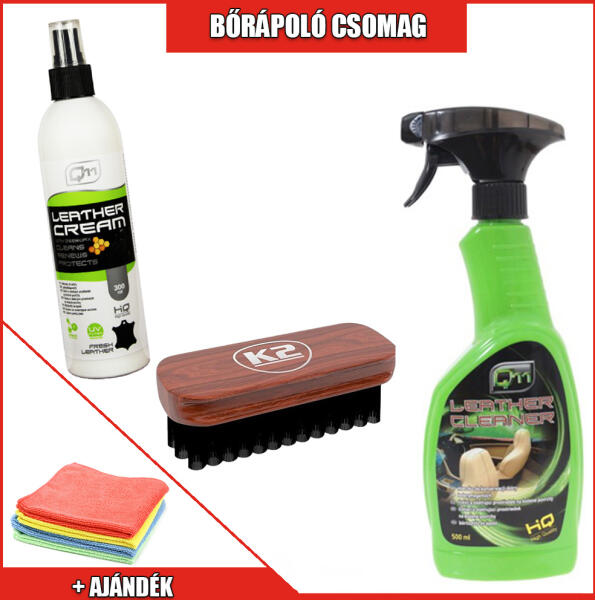 Bőrápoló csomagHa szereted tisztán tartani az autód bőrkárpitjait akkor erre az autós bőrápoló csomagra biztosan szükséged lesz!Ezzel a készlettel tökéletesen megtudod tisztítani az autód belső bőr elemeit. Ha nem te szeretnéd összeválogatni a termékeket, akkor az előre összeállított csomag tökéletes választás.  Úgy állítottuk össze a csomagot, ahogyan mi is használnánk őket egy egy tisztítási munkához. Ár érték arányban a legjobb termékeket tartalmazzák.  A csomag tartalmaz egy bőr tisztító szert egy bőrápoló szert, bőrtisztító kefét, és egy ajándék mikroszálas törlőkendőt.  Bőrápoló krémA bőrülések és bőrkárpitok kényesebbek mint a szövetek. Folyamatos törődést igényelnek, azonban ha megfelelően vannak tisztítva akkor hosszú ideig tökéletes állapotban maradnak. A bőrápoló krém egyszerre tisztítja és ápolja a bőr üléseket illetve kárpitokat. Tökéletes választás egy általános tisztításhoz mivel a bőr felületéről leszedi a szennyeződést, de anyagának köszönhetően táplálja is az anyagot. Krém szerű az állaga, mikroszálas ronggyal érdemes felvinni a bőrkárpitra és körkörös mozdulatokkal áttörölni azokat. A tisztítás mellett egy védőréteget is képez a bőrfelületen így nehezebben koszolódik be. A krém fresh leather(friss bőr) illatú. Űrtartalma:300ml