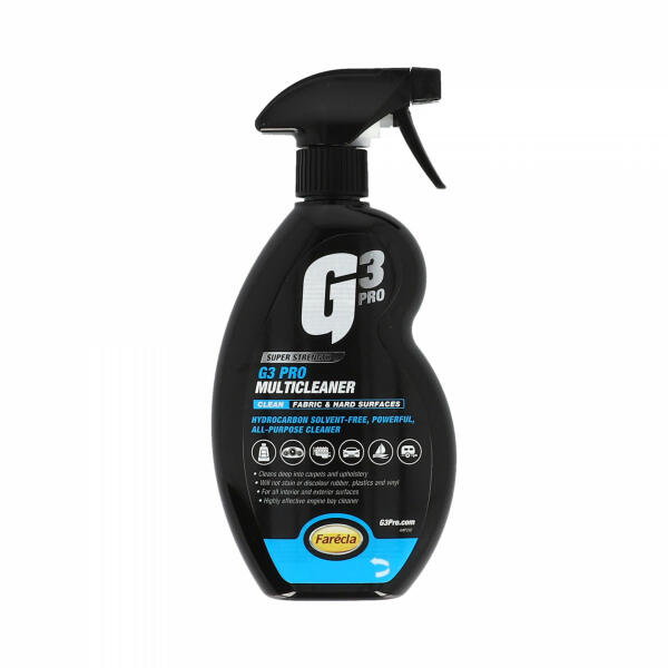 A G3 Pro Multicleaner egy agresszív, mégis biztonságos univerzális tisztítószer (APC), amely minden puha és kemény felületen használható, beleértve a motortereket, a kerékjárati íveket, a szőnyegeket és a kárpitokat. Ez egy szilikonmentes tisztítószer, amely nem színezi el a gumit, a műanyagokat vagy a szövetet. A maximális teljesítmény érdekében tiszta állapotban használja, de vízzel hígítható, könnyebb szennyeződés esetén. Használat: < strong> BELSŐ – Használat előtt alaposan porszívózza ki a jármű belsejét