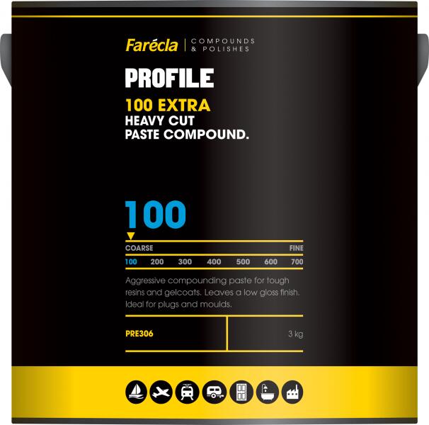 „Folyékony csiszolópapírunk, a Profile 100 Extra egy durva, vízbázisú vágómassza, amelyet kemény gyanták és gélbevonatok agresszív keverésére terveztek. Eltávolítja a P600 száraz csiszolási nyomokat a legtöbb aljzatról, viszonylag alacsony fényű felületet hagyva maga után. A Profile 100 Extrát gyakran használják a kétlépcsős polírozási folyamat első szakaszában, amikor magas fényűre van szükség. Használat:Ha szükséges, polírozás előtt csiszoljon egészen: