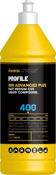 A festett felületek és falakkok legmagasabb vágási és fényességét kínáló Profile 400 Advanced Plus Fast Medium Liquid Compound magasabb árat követel, mint a többi Profile keverék, de kevésbé valószínű, hogy másoknál másodlagos befejező lépésre van szükség – nagyra értékelt időmegtakarítás. nagy volumenű műveleteknél. A G Mop Lambs gyapjúpárnán vagy a G Mop Yellow keverőhabon használva a Profile 400 Advanced Plus képes örvénylés- és hologrammentes felületet hagyni a világosabb színeken. Opcionálisan sötét színeken a fényesség mélysége tovább fokozható a Profile Finish használatával a G Mop Black Finishing Foam-on. Gyorsan megszünteti a P1500 csiszolási nyomokat és hibákat a festék, lakk, akril, plexi és gelcoat felületekről, magas fényességet hagyva maga után. Használható magasfényű, egylépéses eljárásként fehér gyártású gélcoatokon, ha P1200 vagy P1500 csiszolással. Használat:Ha szükséges, polírozás előtt csiszoljon egészen: