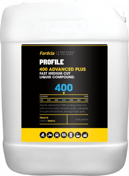 A festett felületek és falakkok legmagasabb vágási és fényességét kínáló Profile 400 Advanced Plus Fast Medium Liquid Compound magasabb árat követel, mint a többi Profile keverék, de kevésbé valószínű, hogy másoknál másodlagos befejező lépésre van szükség – nagyra értékelt időmegtakarítás. nagy volumenű műveleteknél. A G Mop Lambs gyapjúpárnán vagy a G Mop Yellow keverőhabon használva a Profile 400 Advanced Plus képes örvénylés- és hologrammentes felületet hagyni a világosabb színeken. Opcionálisan sötét színeken a fényesség mélysége tovább fokozható a Profile Finish használatával a G Mop Black Finishing Foam-on. Gyorsan megszünteti a P1500 csiszolási nyomokat és hibákat a festék, lakk, akril, plexi és gelcoat felületekről, magas fényességet hagyva maga után. Használható magasfényű, egylépéses eljárásként fehér gyártású gélcoatokon, ha P1200 vagy P1500 csiszolással. Használat:Ha szükséges, polírozás előtt csiszoljon egészen: