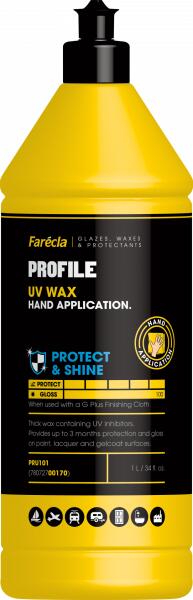 A Profile UV Wax Hand Application egy speciális UV-elnyelő anyagokat tartalmazó folyékony viasz, amely akár 3 hónapos védelmet biztosít a külső időjárási hatásoknak kitett gél bevonatok és festékek számára. Hosszan tartó védelem az eső és a sós víz ellen, míg az UV-elnyelők védenek a napfénytől. A Profile UV Wax fényes, hosszan tartó felületet biztosít a legtöbb felületen, és különösen alkalmas hajókra, lakókocsikra, vonatokra és repülőkre. Használat:Ez a termék önmagában vagy 3 lépésben használható örvény és hologram eltávolítás után a következőkkel: