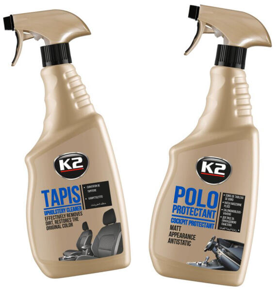 K2 belső autóápolási csomagA K2 termékcsalád 1-1 legnépszerűbb termékét tettük be ebbe a csomagba. Az autó belső tisztításához elengedhetetlen egy jó műszerfalápoló, és egy kárpittisztító szer. Ha nem te szeretnéd összeválogatni a termékeket, akkor az előre összeállított csomag tökéletes választás.  Úgy állítottuk össze a csomagot, ahogyan mi is használnánk őket egy egy tisztítási munkához. Ár érték arányban a legjobb termékeket tartalmazzák.  Az autóápolási csomag tartalmaz egy K2 műszerfalápoló sprayt  és egy K2 műanyagápoló sprayt. Műanyagápoló és felújító spray K2 MATT, SZILIKONMENTESA K2 Polo ápolja és tisztítja a műanyag elemeket, anélkül hogy fényes felületet hagyna maga után. Speciális összetételének köszönhetően UV védő réteggel látja el a kezelt felületet.  A termék szilikonemntes!A benne található összetevők felfrissítik  a műanyag elemeket, és visszaadják a színét. Használható belső elemekre is mint például a műszerfal és az ajtópanelek, de külső használatra is megfelelő. A lökhárítók, tükör körüli műanyagok és díszlécek felújítására is alkalmas. Űrtartalom: 770ml