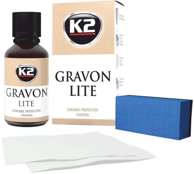 A K2 GRAVON LITE a legegyszerűbb és leggyorsabban alkalmazható kerámia bevonat, amely megvédi a festéket a karcolásoktól, szennyeződésektől, UV sugaraktól és egyéb külső tényezőktől. A bevonat rétegenként is felvihető, minden további réteggel akár 2 évig is felvihető. A kerámia bevonat kiváló alternatívája az autóviaszoknak, kiváló taszító tulajdonságainak köszönhetően csökkenthető a mosás gyakorisága. A kerámia bevonatot a viaszokkal ellentétben nem lehet vegyszerekkel lemosni, ezért ez a legtartósabb módja a festék védelmének. A bevonat eltávolításának egyetlen módja a gépi polírozás. A kerámia bevonat a graffiti ellen is véd, a felvitt festék nem tapad a felületre, könnyen eltávolítható. A K2 GRAVON LITE 30 ml termék 2 rétegben elegendő a festékre (az autó méretétől függően). A szett tartalma: K2 Gravon Lite 30 ml + applikátor + 2 törlőkendő. I. Optimális alkalmazási feltételekAlkalmazza egy szobában vagy árnyékos helyen. II. Felület előkészítésA festéket alaposan mossa le és szárítsa meg, a felület szennyeződésmentes legyen. III. AlkalmazásA kerámiabevonat felhordása előtt alaposan zsírtalanítsa le a felületet a K2 T6 KLINET-  tel mikroszálas - pl. mikroszálas K2 Bona - segítségével . Rázza fel alaposan az üveget, és cseppentsen 6-8 cseppet az applikátor köré tekert száraz törlőkendőre. Vigye fel keresztben, egyszer legfeljebb 2 darabra. A felhordástól számított 5-10 perc elteltével fényesítse le a felületeket mikroszálas anyaggal (magasabb hőmérséklet lerövidíti a száradási időt, alacsonyabb hőmérséklet meghosszabbítja). Ne hagyja, hogy a bevonat megszáradjon a lakkon. Az első réteg felhordása és polírozása után várjon min. 1 óra, és vigyen fel még egy réteg festéket. IV. Alkalmazás utánNe mossa az autót semmilyen vegyszerrel a következő 7 napban.