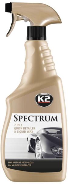 A K2 SPECTRUM egy egyedülálló folyékony viasz, amelyet a legújabb technológiai vívmányok alapján hoztak létre. Ennek köszönhetően minden erőfeszítés nélkül viaszolhatja az autófestéket, mély fényezést kölcsönözve neki. Elég bepermetezni a felületet, majd letörölni, nem kell megvárni a viasz megszáradását. A K2 SPECTRUM könnyen polírozható és nem hagy fehér csíkokat. Kiváló minden festéktípushoz. Meleg felületen használható. Több ezer alkalmazással rendelkezik. Ideálisan alkalmas műanyagok, lámpák, műszerfalak, krómozott és gumi alkatrészek, gumiabroncsok, bőr és ablakok felújítására. Óriási tulajdonságai otthonban vagy irodában is használhatók, bútorok, ablakok, műanyagok, LCD képernyők, üvegek stb. védelmére. Kellemes aromájú, melyhez a komponensek friss illatúak.