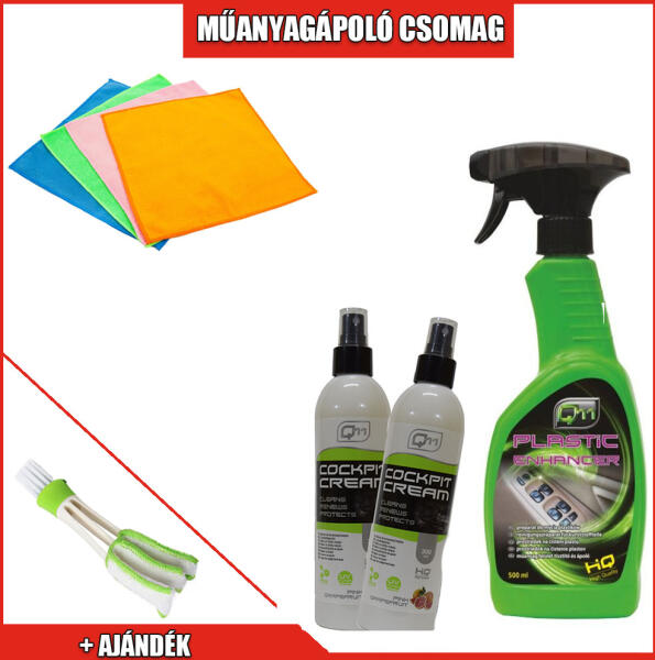 Műanyagápoló és felújító csomagHa szereted tisztán tartani és ápolni az autód műanyag elemeit akkor erre a műanyag ápoló és felújító csomagra biztosan szükséged lesz!Ezzel a készlettel tökéletesen megtudod tisztítani az autód külső és belső műanyag elemeit. Ha nem te szeretnéd összeválogatni a termékeket, akkor az előre összeállított csomag tökéletes választás.  Úgy állítottuk össze a csomagot, ahogyan mi is használnánk őket egy egy tisztítási munkához. Ár érték arányban a legjobb termékeket tartalmazzák.  A csomag tartalmaz egy műanyag tisztító és egy műanyagápoló sprayt, mikroszálas törlőkendőt, és egy ajándék tisztító kefét.  Műanyagápoló és felújító sprayA műanyag elemek is igénylik a megfelelő tisztítást és ápolást. Ehhez érdemes olyan szert használni ami kimondottan erre lett kialakítva. A Q11 műanyagápoló és felújító spray az ideális megoldás erre a feladatra. A termékben található összetevők felfrissítik a műanyag elemeket, visszaadják az eredeti színüket, és eltávolítják a szennyeződéseket. A spray használata rendkívül egyszerű, így a műanyag felületek karbantartása és tisztítása gyorsan és hatékonyan