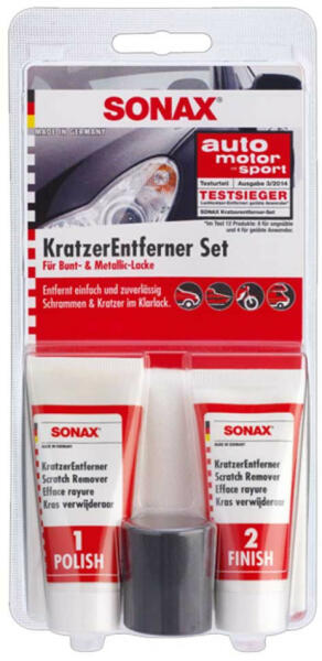 SONAX 305941 KratzerEntferner Set, karceltávolító szett, 50 ml Polírozó szett a felső lakkrétegen keletkezett karcolások kézi eltávolításához. Minden normál, metál és kerámia lakkréteghez használható. A benedvesített csiszolópapírok segítségével még a mélyebb karcolások is eltávolíthatók, ha azok nem érik el a bázislakkot vagy az alapozást. A normál karcolásokat az 1. számú tubusban lévő polírozóval távolítsuk el, majd minden kezelt részt a 2. számú tubusban lévő szer segítségével polírozzunk fényesre!A doboz 3 db polírozó kendőt is tartalmaz.