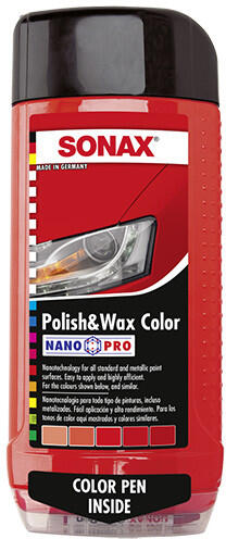 A Sonax Polish & Wax Color NanoPro – piros színű polírozó és viaszolószer kifejezetten olyan járműtulajdonosok számára készült, akik nemcsak tisztítani és fényesíteni szeretnék az autójuk fényezését, hanem egyúttal helyre is állítanák a színtelítettséget, miközben védenék a felületet az időjárás hatásaitól. Ez az 500 ml-es kiszerelésű ápolószer különleges formulát alkalmaz: mikroszkopikus méretű színpigmenteket és nanotechnológiás viaszkomponenst tartalmaz, amelyek tökéletesen illeszkednek a fényezés mikrosérüléseibe, ezáltal elfedve a hajszálkarcokat és az apróbb mattodásokat.