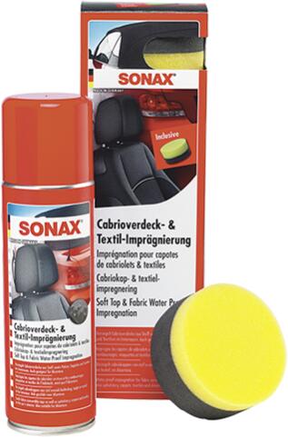 Sonax cabrió tető, textilimpregnáló 250ml (SO310141)A szövet cabrio tetők, valamint az autó belsejében lévő kárpitok, szőnyegek, textilek és alkantara felületek impregnálásához kifejlesztett termék. Különösen az erősen igénybe vett részeket, mint a hajtások és varratok, védi a nedvességgel szemben. Megakadályozza, hogy a nedvesség és a szennyeződések beszivárogjanak a különféle textil és alkantara ülésekbe, szőnyegekbe, kárpitokba. Felfrissíti a színeket és véd az újra szennyeződés ellen. Színtelen, így bármilyen színű felülethez használható.