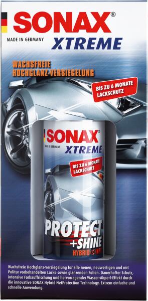 Viaszmentes magas csillogású lakkvédő minden új , újrafényezett és előpolírozott fényezéshez. A SONAX XTREME Protect + Shine tartós védelemmel és fényes védőbevonattal fedi be a fényezést (SONAX Hybrid Net Protection Technology), mely hosszantartó védelmet, a színek intenzív megfiatalodását és kiemelkedő vízlepergető hatást kölcsönöznek. Csökkenti a por és piszok megtapadását, és a ragyogást automatikusan minden mosás után helyreállítja. Elegendő 3-4 alkalomhoz, hihetetlenül gyorsan és könnyen alkalmazható, nem igényel előkezelést és száradási idővel sem kell számolni. 6 hónapon át nyújt tartós védelmet.
