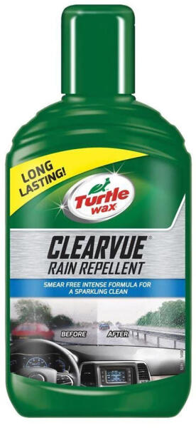 Turtle Wax Clearvue Rain Repellent, Eső lepergető, 300ml A Turtle Wax Clearvue esőlepergető krisztálytiszta szilikonok és gyorsan száradó oldószer egyedülálló keveréke, amely egy tökéletesen átlátszó védőréteget képez, amely taszítja az esővizet, az ónos esőt vagy havat és hatása hónapokig tart.