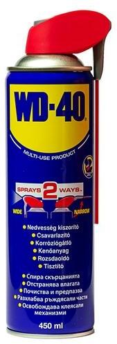 WD-40 multi spray Smart fejes 450ml A WD40 egy multifunkciós nedvességkiszorító, korróziógátló, csavarlazító, tisztító, kenőanyag. A hosszú ideig aktív összetevő egy nem illékony, viszkózus olaj, amely a felszínen marad, ezáltal biztosítva a kenést és a nedvességtől való védelmet. A WD40 ötféle problémát megoldására használható: