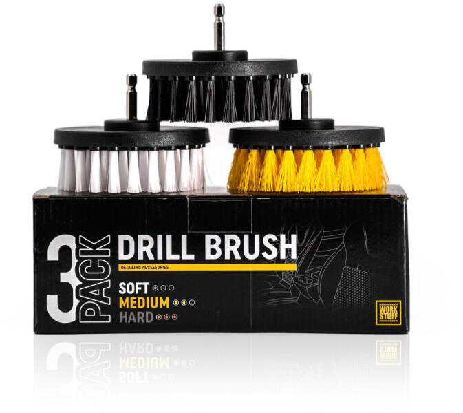 A Work Stuff Drill Brush egy professzionális fúrógépre szerelhető kefe szett , amely lehetővé teszi a kárpit, szőnyeg, csomagtérborítás és padlószőnyeg gyors és alapos tisztítását minimális fizikai erőfeszítéssel. A 3 darabos csomag mindhárom sörtetípust tartalmazza – puha (Soft) , közepes (Medium) és kemény (Hard) –, így mindig a felülethez leginkább megfelelő keménységgel dolgozhatsz, legyen szó autó belsőről vagy otthoni szövetbútorokról.